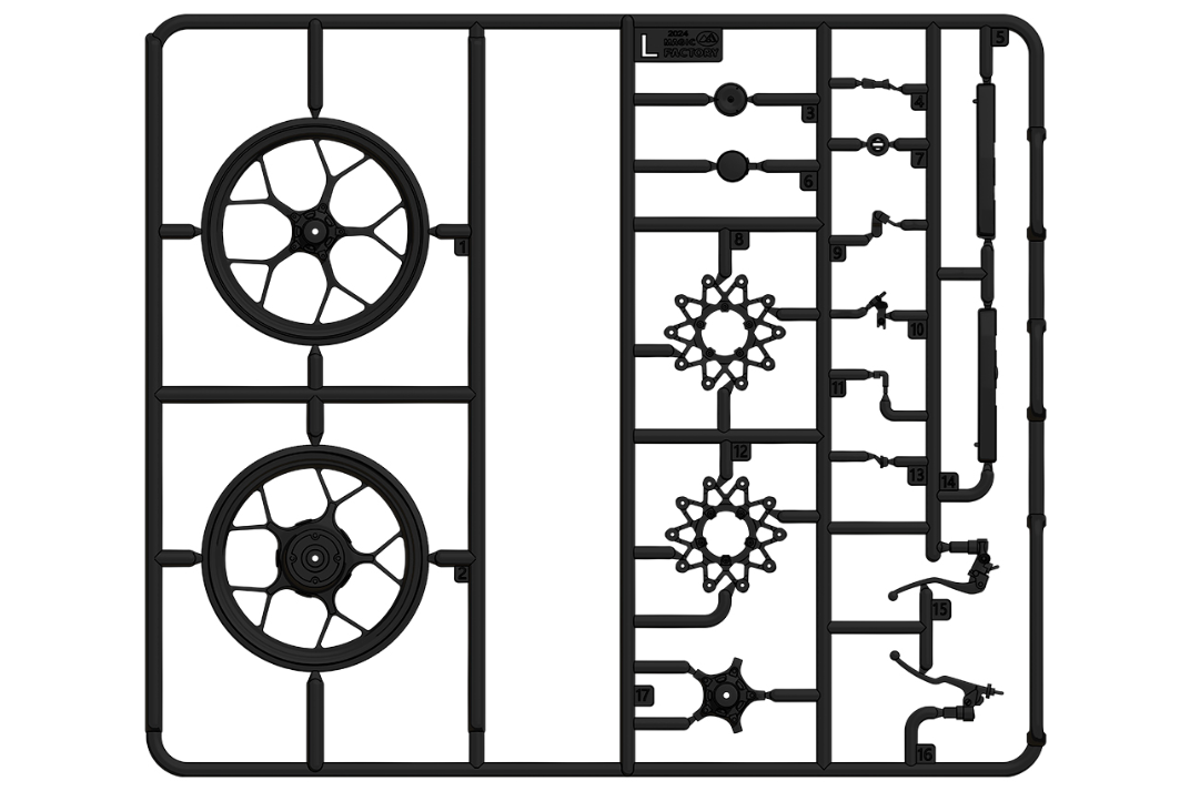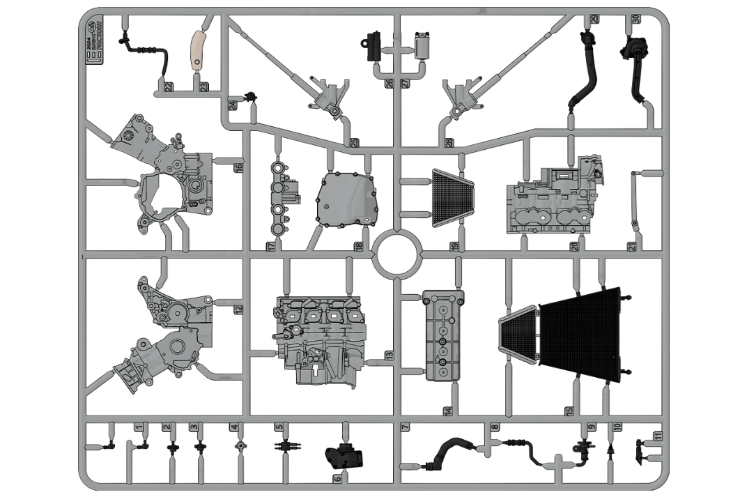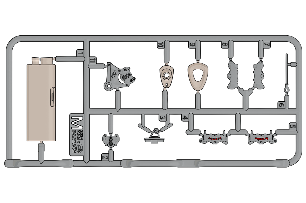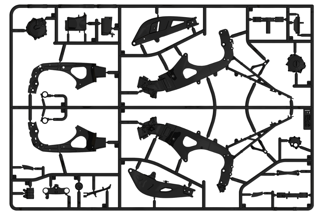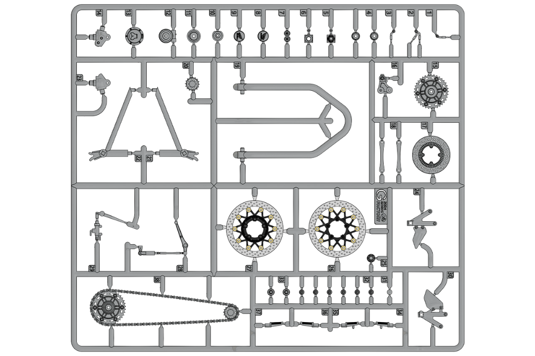 The kit defines in great detail the mechanical parts and the chassis, and has several interesting details, such as the front fork made of metal, some decals made of epoxy resin for the Honda logos that go on the tank, and it even includes a curious magnetic mat so that you can place the screws necessary for assembly on it without risk of losing them.