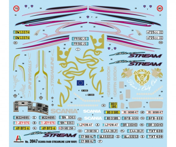 Additional details for the Scania R400 Streamline flat roof tractor head scale model kit: Manufactured by Italeri in 1/24 scale with reference 3947.
