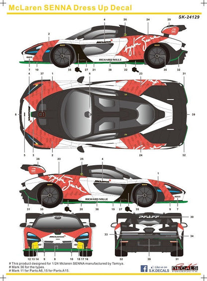 Decal Set produced by SK Decals for the McLaren Senna Sponsored by Richard Mille homage to the mclaren F1 cars with Marlboro livery drive by Senna.