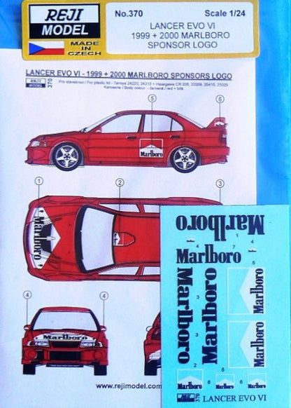 Decal Setmade by Reji Model in 1/24 Scale with the Marlboro Missing logos used on the Mitsubishi Lancer Evo VI from the 1999 and 2000 seasons, in rallys where the law's still admit Tobacco publicity. this set will complete your model in a more realistic and beautiful way.