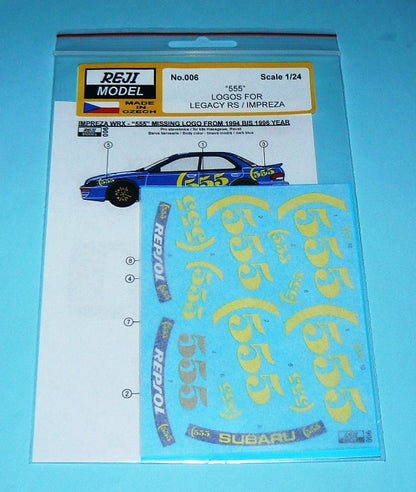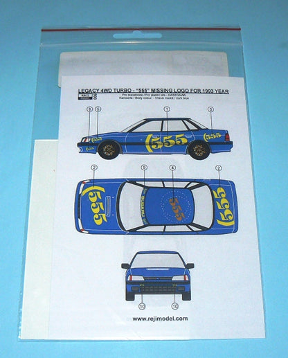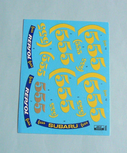 This is the new design updated set of decals of Reji Models, which includes the 555 tobacco logos necessary to complete the decorations of the official cars of the Subaru team, like the 1993 Legacy Group A and the Impreza Group A among the years 1994 and 1996.