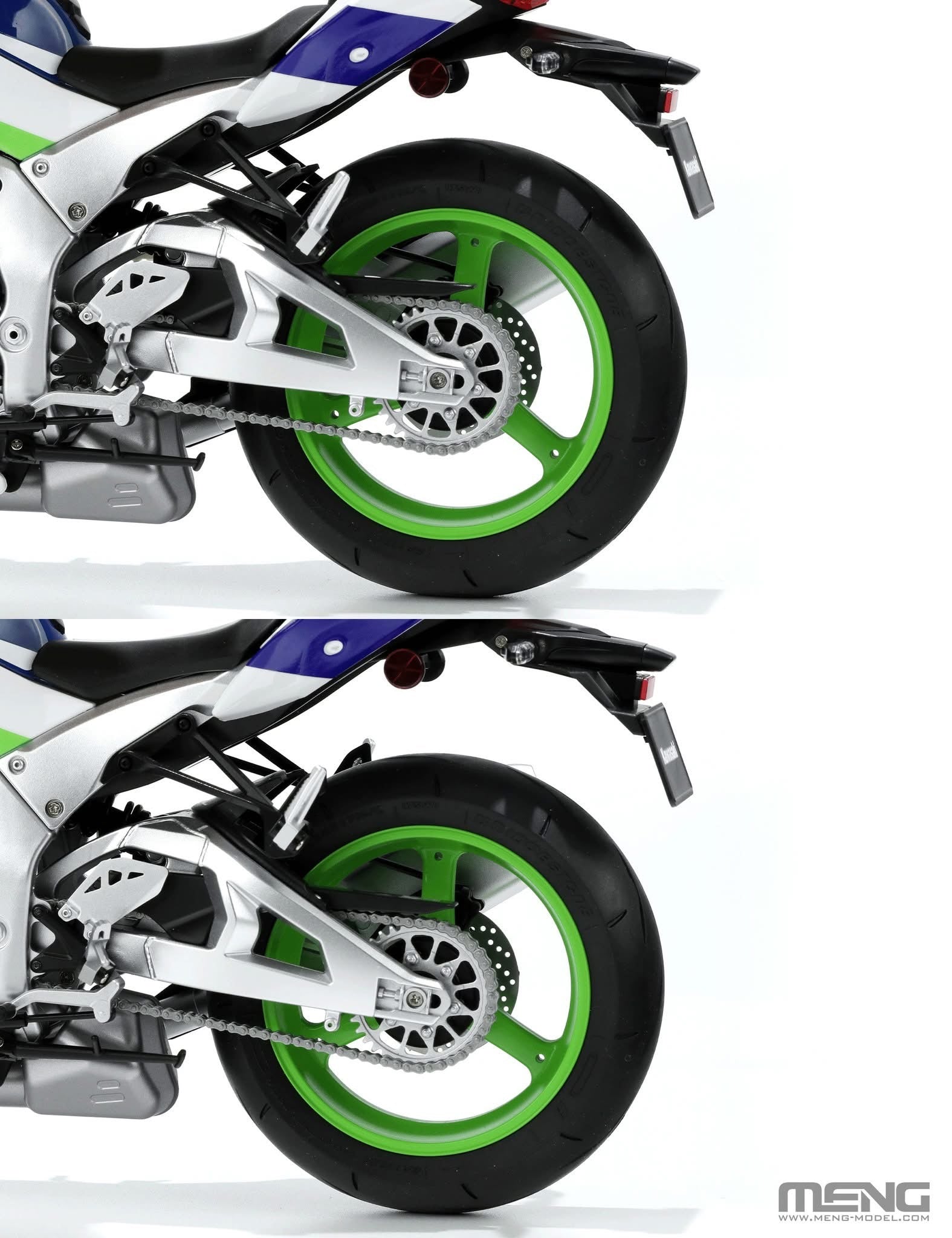 Additional details for the Kawasaki Ninja ZX-10R motorbike scale model kit: Manufactured by Meng Model in 1/9 scale with reference MT007S.
