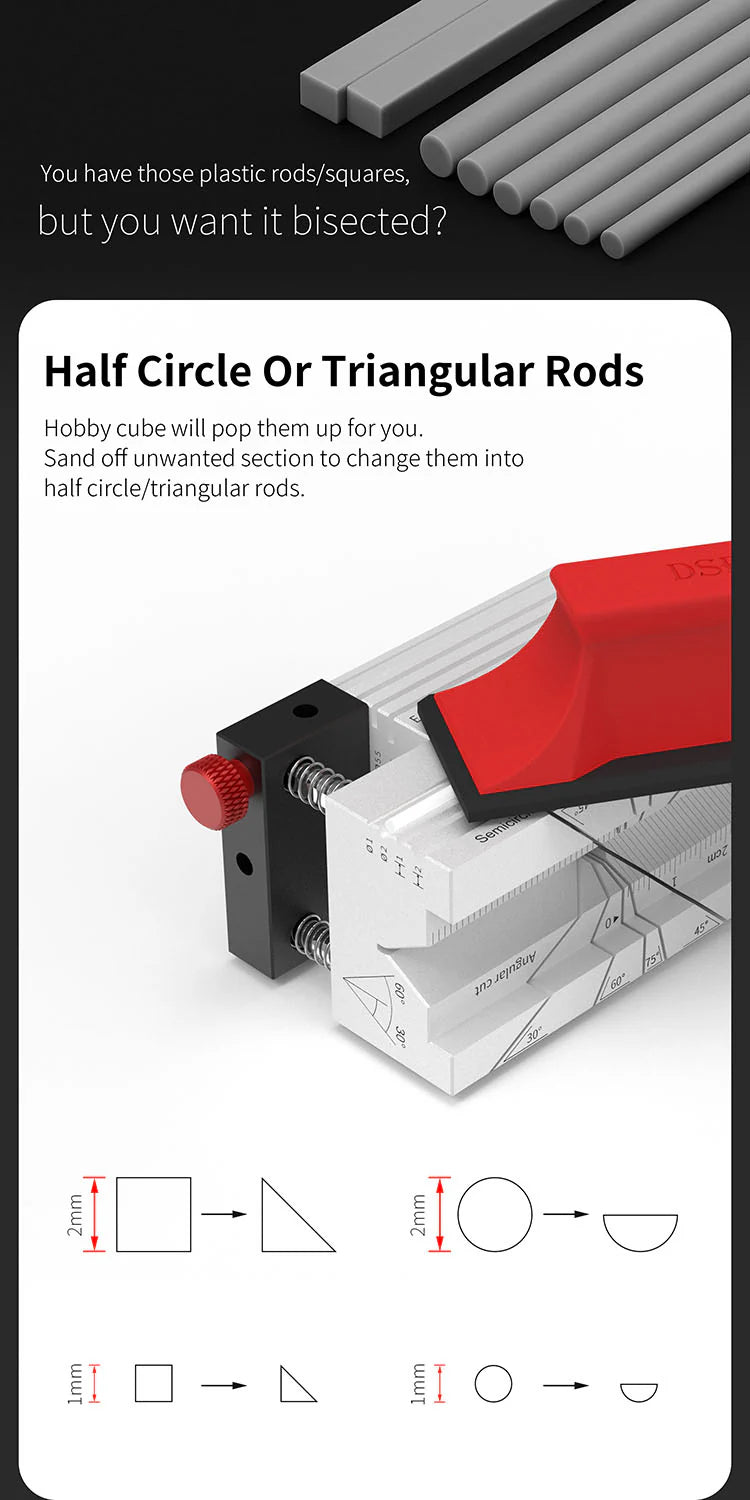 Ideal for cutting straight styrene strips, sanding corners, making mitre cuts, and drilling round rods, etc.