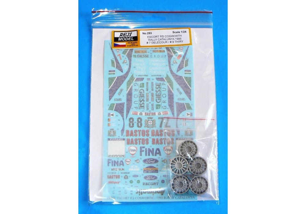 This is a transkit made by Reji in 1/24 scale that includes a decal sheet, and a set of 5 OZ four-bolt rims to be able to carry out the decoration used by the Ford Escort RS Cosworth Group A of the official Ford team during its participation in the Rally of Catalunya in 1995. It Includes also the numbers for the two team cars.