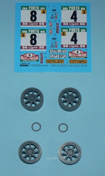 the transkit includes the wheels used by Ford in the Portuguese Rally and the Livery Decals.
