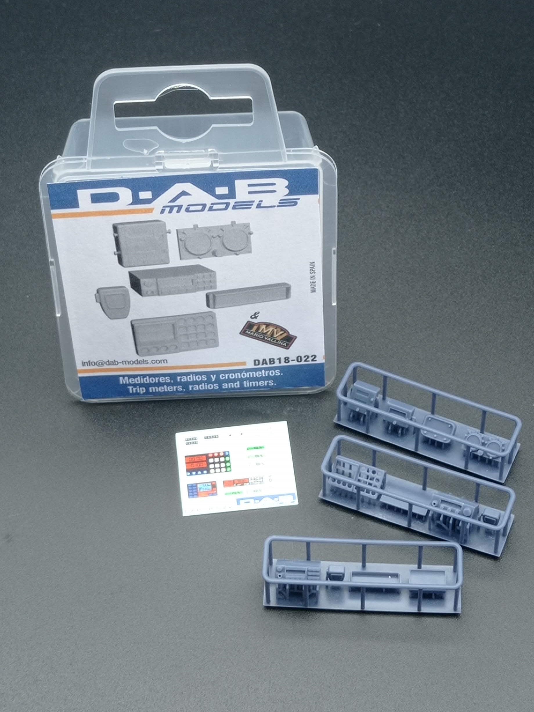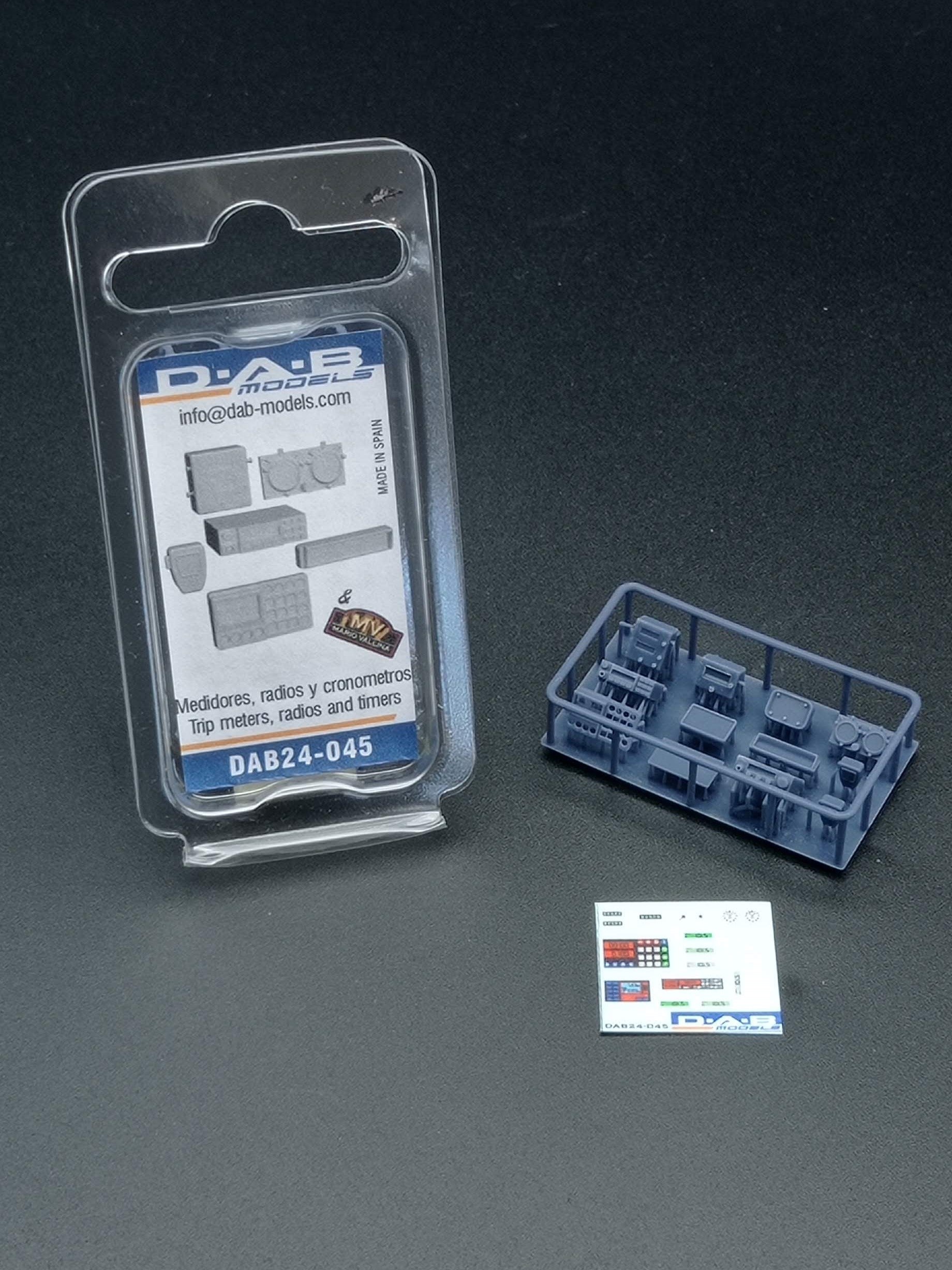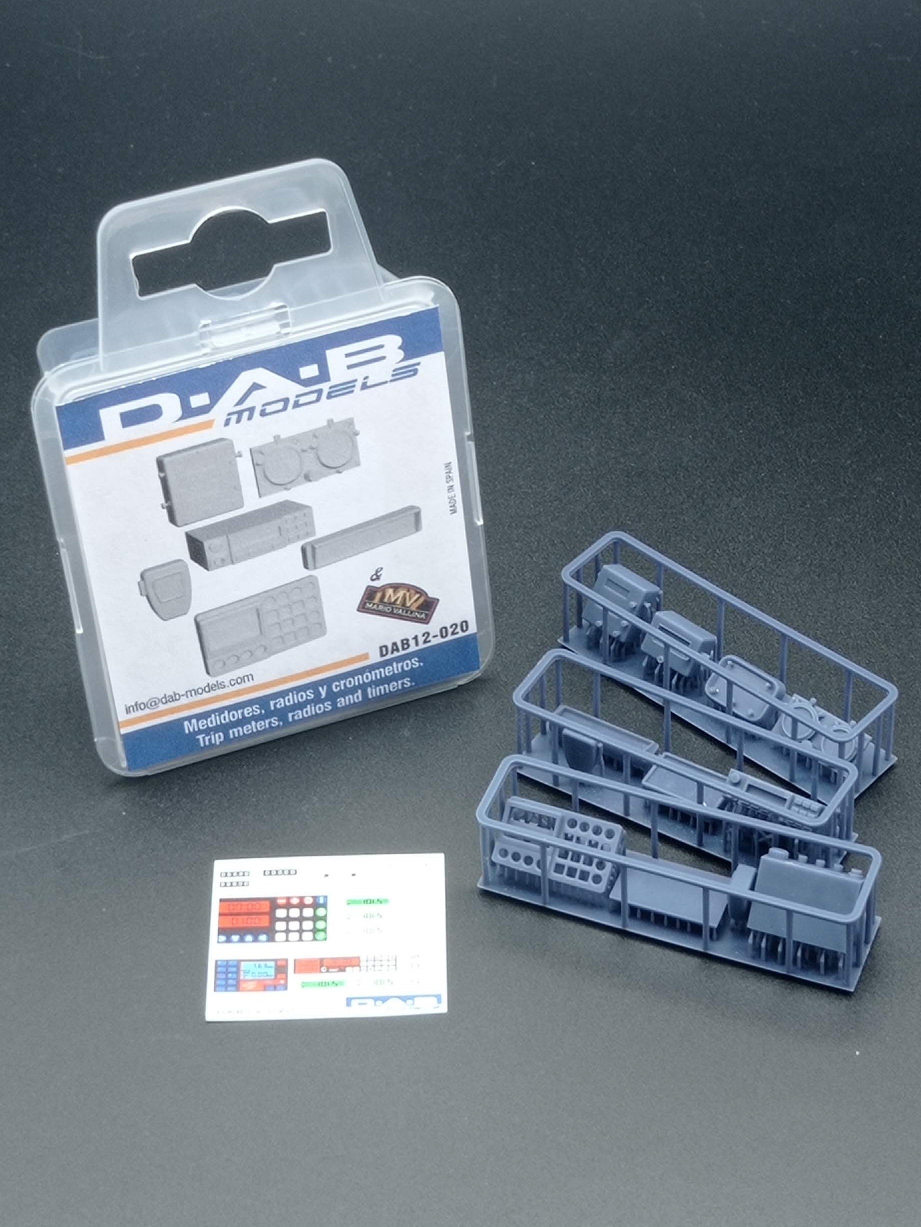 Additional details for the Trip meters, radios and timers detail: Manufactured by D.A.B. Models in 1/24, 1/18, 1/12 scales with references DAB24-045 DAB18-022 DAB12-020